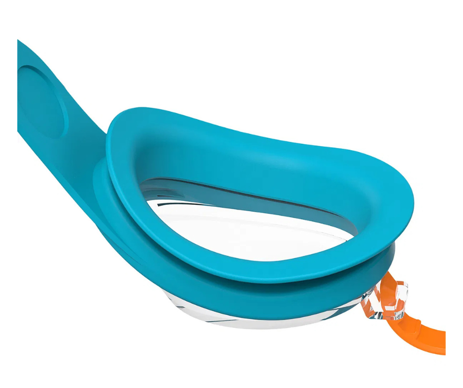 De bløde silikonekanter og den justerbare næsebro sikrer et behageligt og tæt fit omkring barnets hoved – både i vandet og på kanten.